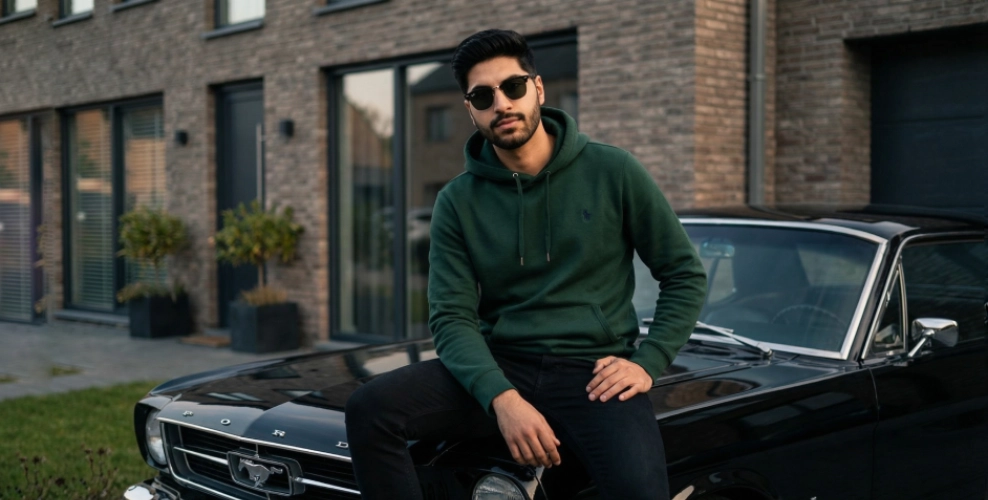 "Create hyper realistic cinematic portrait of me using my uploaded photo as the facial reference.I am sitting casually on the front hood of a classic black vintage muscle car1960s style parked outside a modern luxury house with brick walls and large glass windows.I am wearing a dark green hoodie, black jeans and black sunglasses with a confident and calm expression. posture is relaxed: One leg bent on the car, one foot on the ground, one hand resting on my knee.Lighting should be natural daylight, soft shadows and a cinematic depth of field.Background slightly blurred for a premium DSLR look.Style: Modern luxury, masculine, aesthrtic lifestyle photography camera: 50mm lens, ultra sharp focus, skin tone, facial features, beard and hairstyle must match my reference photo accurately.No distortion, no cartoon effect, no extra people, no logo text."