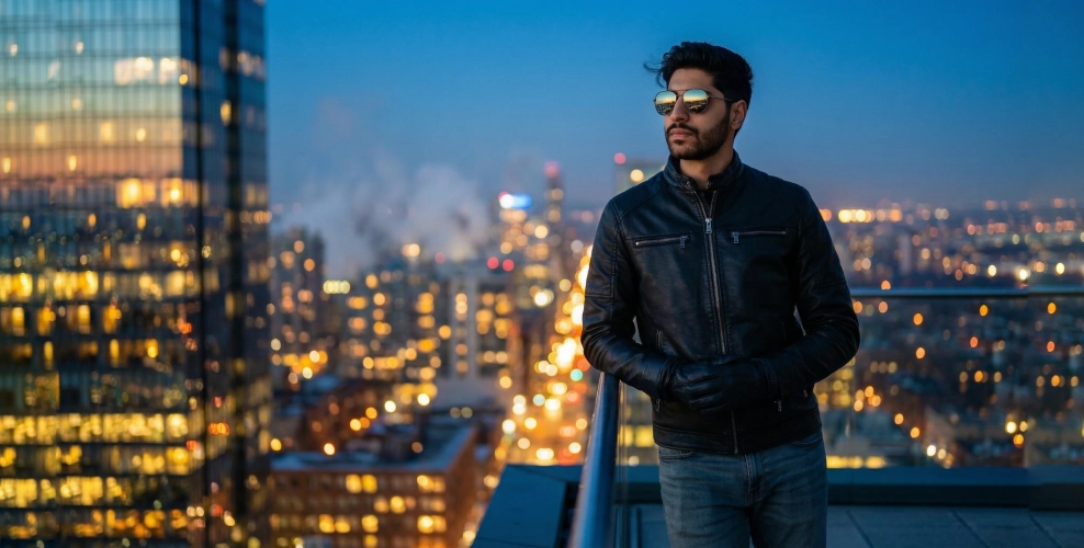 "Create a cinematic rooftop portrait of a man at dusk, inspired by modern urban photography. Use the uploaded reference photo if available, with sharp facial features, trimmed beard and styled hair.he is wearing a black leather jacket, dark gloves, jeans and stylish sunglasses.He is standing confidently on a high rise rooftop, hands relaxed near the railing, looking slightly to the side.Background: A City skyline at blue hour with bokeh city lights, tall glass buildings, glowing windows and soft fog or mist in the distance. lighting: cinematic dusk lighting, cool blue tones mixed with warm city lights, soft rim light on the subject, professional fashion photography style.Camera style: DSLR, shallow depth of field, 85mm lens look, ultra realistic, sharp focus on subject background slightly blurred.Quality: ultra-high resolution, realistic skin texture, natural colors, no distortion."