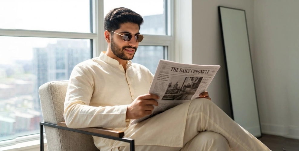 "A photorealistic portrait of this person sitting in a modern armchair near a large window in a bright, minimalist apartment. i am wearing an elegant off white traditional kurta style outfit with a tailored fit. i have a well groomed beard, neatly styled hair and i'm wearing subtle, stylish sunglasses, i am calmly reading a newspeapr, legs crossed, giving a confident and sophisticated look. soft natural daylight is coming through the window, creating gentle shadows and a warm, cinematic atmosphere. the background is clean and modern with neutral tones, shallow depth of field, ultra high resolution, professional lifestyle photography, sharp focus, realistic skin texture, editorial magazine style."