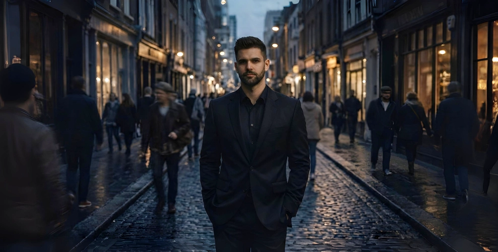 "Create a cinematic, ultra realistic portrait of a person standing perfectly still in the middle of a narrow urban street at dusk, with soft fading daylight moody shadows, shallow depth of filed realistic skin texture, dramatic lighting and a film like colour grade. i am wearing a perfectly tailored black suit with a black shirt, minimal and elegant style. uploaded image face is sharp, clear and in perfect focus with natural skin texture and realistic facial details. the background shows a busy city street with brick walls, cobblestone road and pedestrians walking in both directions. all surrounding people appear in strong motion blur,Creating a contrast between my stillness and the moving crowd. lighting is moody and cinematic with soft ambient street lights, cool shadows and subtle highlights on my face. depth of field is shallow: i am fully sharp, background slightly blurred. camera style: professional DSLR, 50mm lens, cinematic color grading, high dynamic range, dramatic urban atmosphere. expression: calm, confident, serious.Style: Modern cinematic photography, realistic, high resolutions, no distortion, no extra people in focus, no blur on my face."