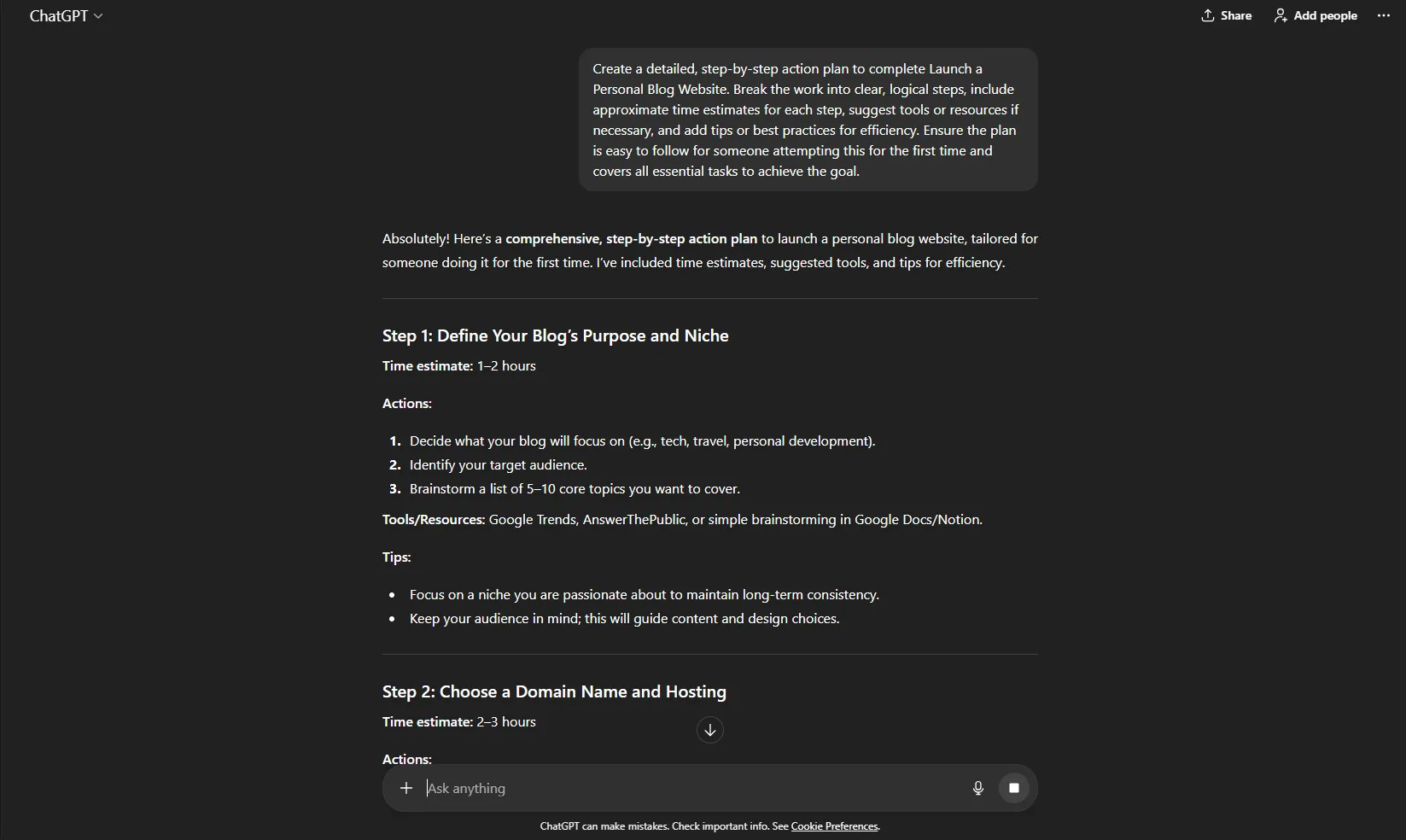 Breaking large tasks or projects into manageable steps can be overwhelming. ChatGPT can create structured, actionable plans to guide you through projects efficiently.