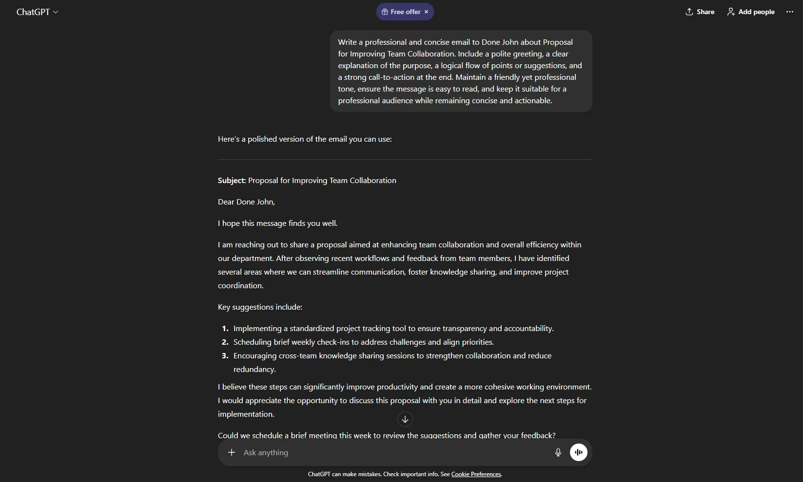 Crafting professional emails or messages can be time-consuming, especially when tone and clarity matter. ChatGPT can produce polished drafts instantly.