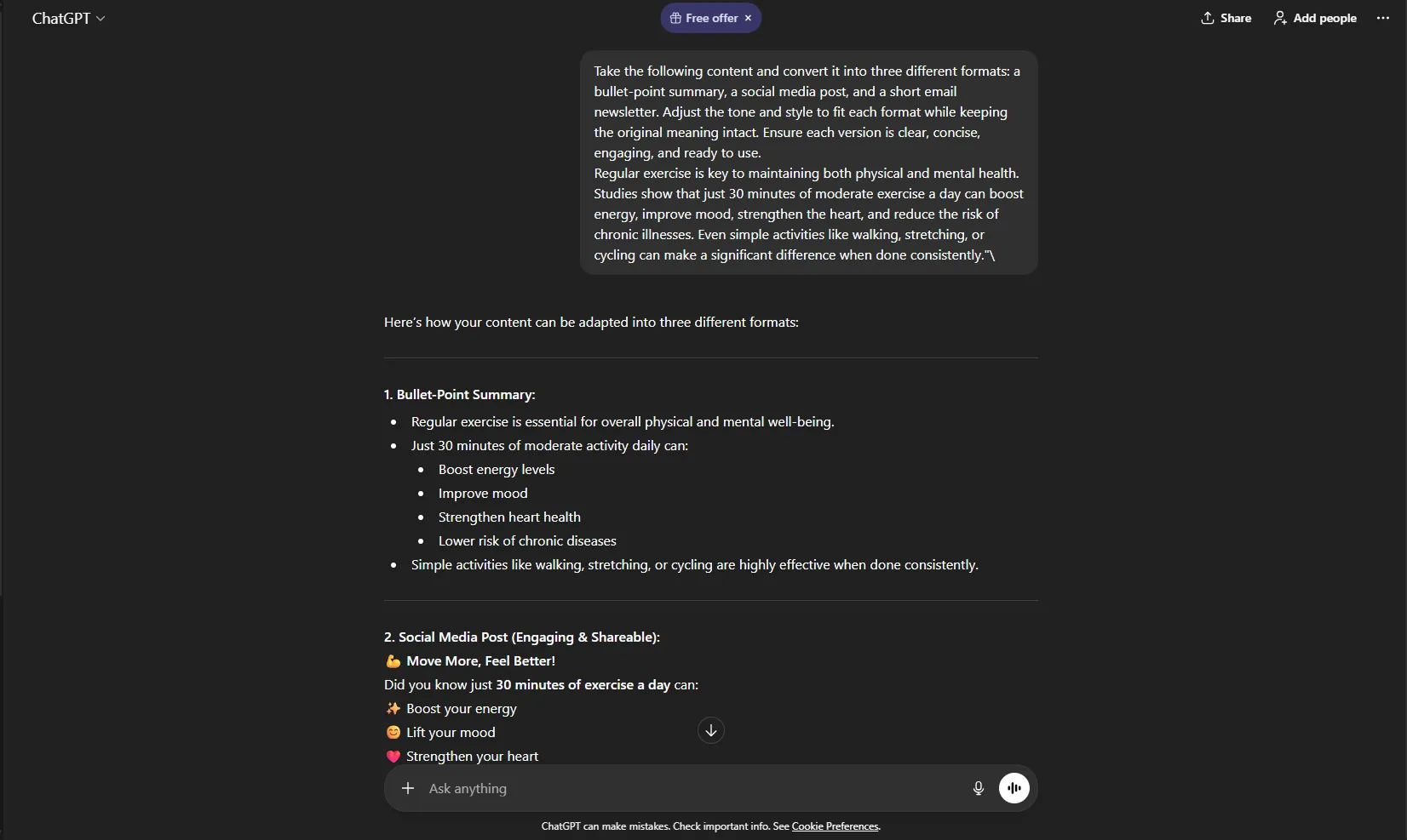 Repurposing content manually takes a lot of time. ChatGPT can convert one piece of content into multiple formats quickly.