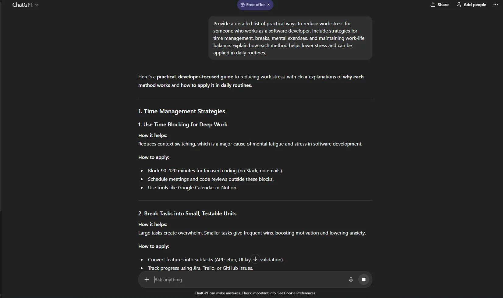“Provide a detailed list of practical ways to reduce work stress for someone who works in [industry/job role]. Include strategies for time management, breaks, mental exercises, and maintaining work-life balance. Explain how each method helps lower stress and can be applied in daily routines.”