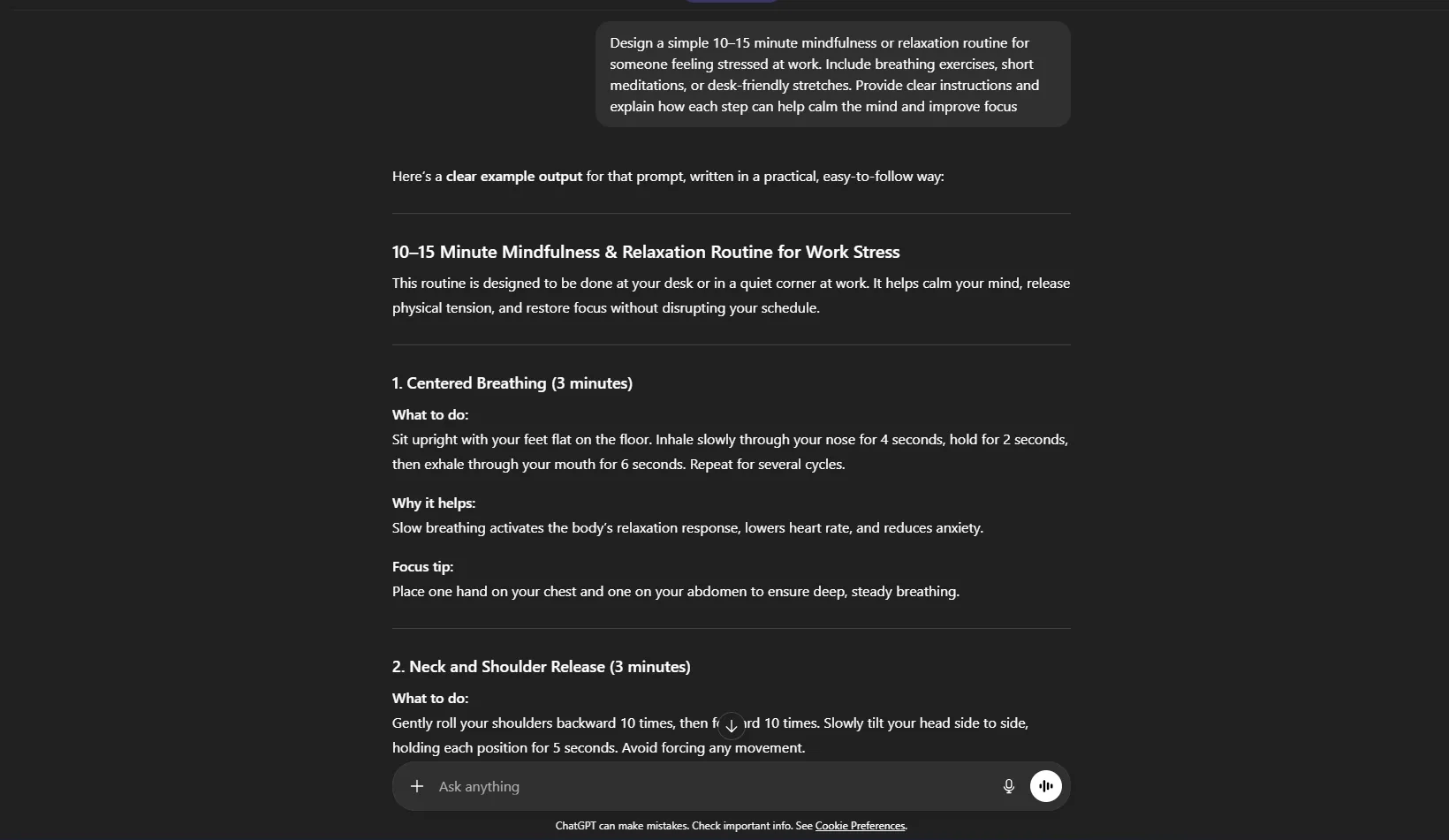 Mindfulness and relaxation techniques are scientifically proven to reduce stress. This prompt guides ChatGPT to craft step-by-step routines suitable for busy professionals.
