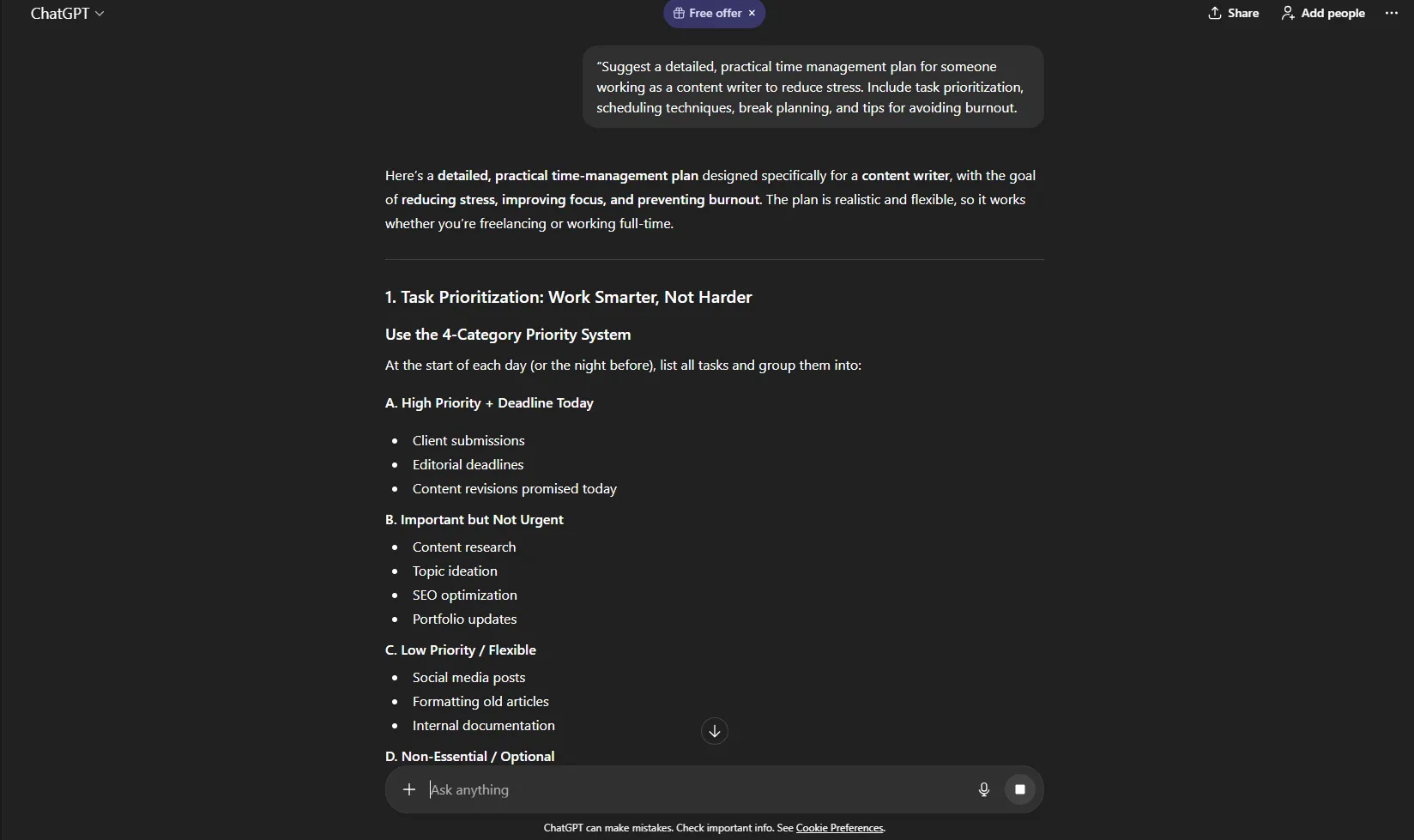 “Suggest a detailed, practical time management plan for someone working in [industry/job role] to reduce stress. Include task prioritization, scheduling techniques, break planning, and tips for avoiding burnout. Explain why each step is effective for improving focus and reducing work pressure.”