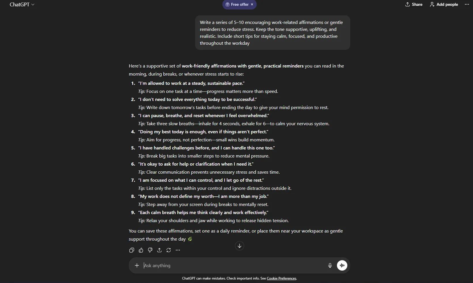 “Write a series of 5–10 encouraging work-related affirmations or gentle reminders to reduce stress. Keep the tone supportive, uplifting, and realistic. Include short tips for staying calm, focused, and productive throughout the workday.”