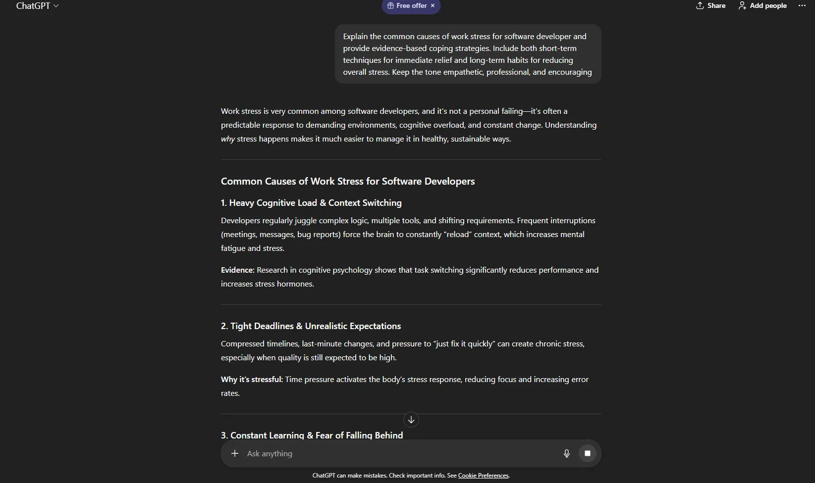 “Explain the common causes of work stress for [job role/industry] and provide evidence-based coping strategies. Include both short-term techniques for immediate relief and long-term habits for reducing overall stress. Keep the tone empathetic, professional, and encouraging.”