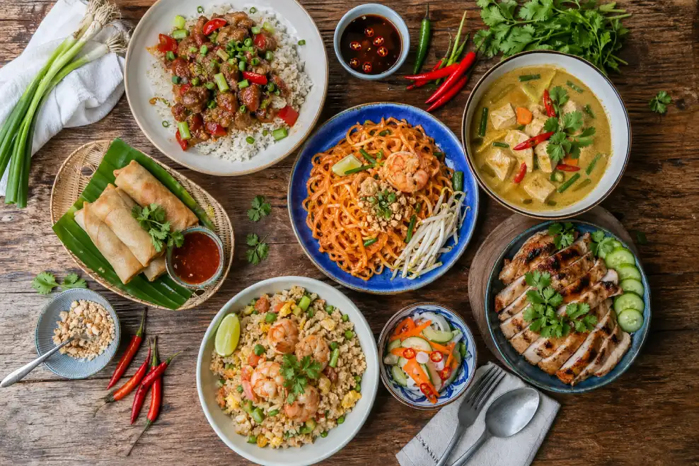 Prompt: Ultra-realistic top-down flat lay food photography of multiple dishes including [dish names], arranged aesthetically on a wooden table. Balanced composition with vibrant colors, clean spacing, and organized placement. Natural daylight with soft shadows enhances depth and realism. Props like cutlery, napkins, and herbs add styling. Professional restaurant photography, Instagram-worthy layout, highly detailed textures, 8K resolution.