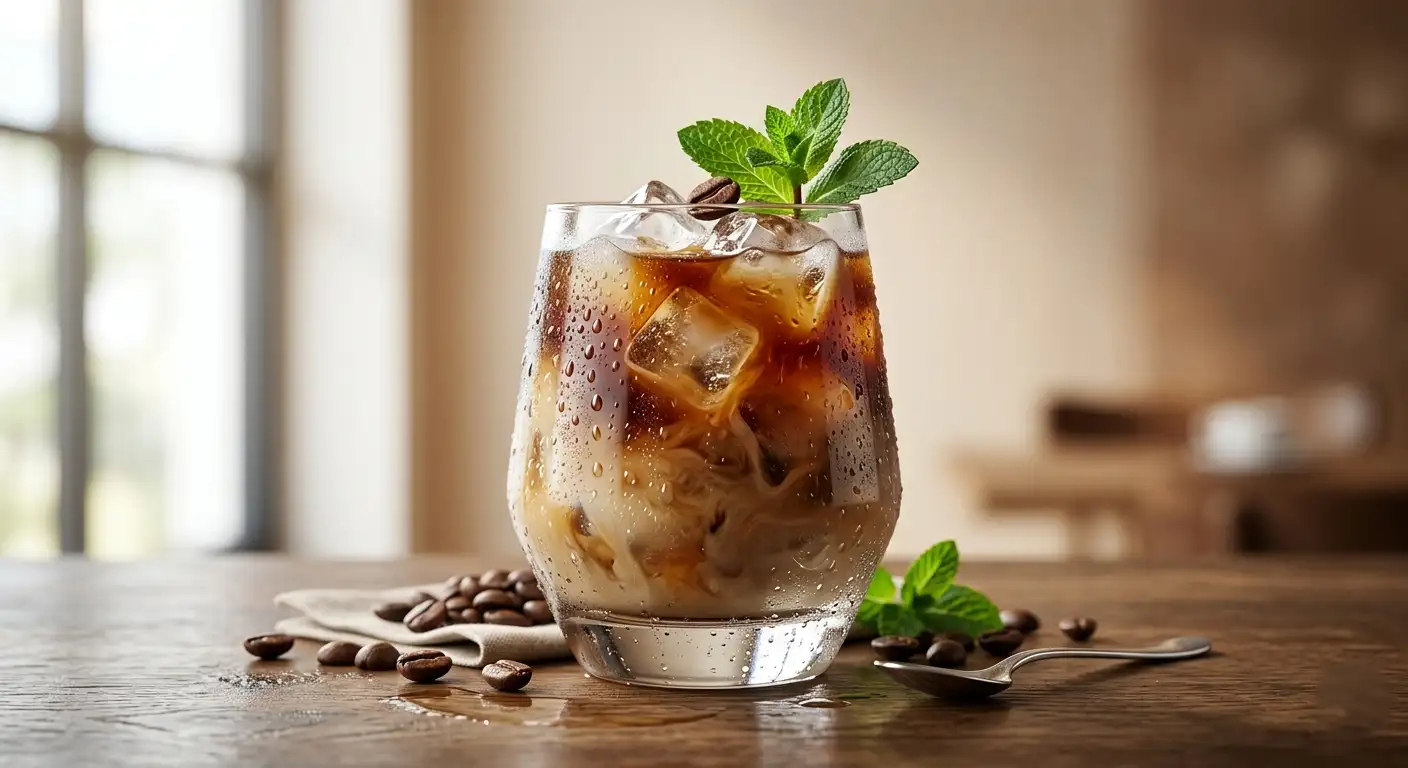 Prompt: Ultra-realistic commercial beverage photography of [cold drinks], served in an elegant premium glass filled with crystal-clear ice cubes. The glass surface features detailed condensation droplets, enhancing the chilled, refreshing feel. The coffee exhibits rich, natural tones with smooth gradients from deep brown to creamy highlights, showcasing realistic liquid transparency. Garnished with fresh mint leaves and subtle coffee beans, styled organically around the scene for a natural, premium aesthetic. Cinematic lighting setup combining soft diffused glow with dramatic highlights, creating rich reflections and refractions through the glass and liquid. Subtle surface reflections with a slight gloss finish add depth and realism. Clean minimal gradient background (light beige to warm brown) to maintain focus on the subject. Shallow depth of field with soft bokeh background enhances subject isolation. Hyper-detailed textures, ultra-sharp focus on the drink, realistic shadows, and natural light falloff. Luxury commercial advertising style, DSLR photography, ultra-HD, 8K resolution, studio-quality beverage shoot.
