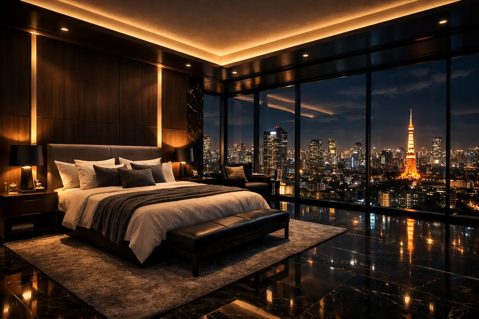 Prompt: A luxurious penthouse bedroom interior at night, featuring expansive floor-to-ceiling glass walls with a breathtaking panoramic city skyline view. A king-size bed with premium linens, soft textures, and layered pillows sits centered in the room. Ambient LED lighting integrated into walls and ceiling creates a warm, relaxing mood. Dark wood panels, matte black accents, and polished marble surfaces enhance the modern aesthetic. Subtle reflections on glass surfaces, cinematic night lighting, ultra-realistic shadows, 8K resolution, high dynamic range, elegant and sophisticated mood, photorealistic rendering.