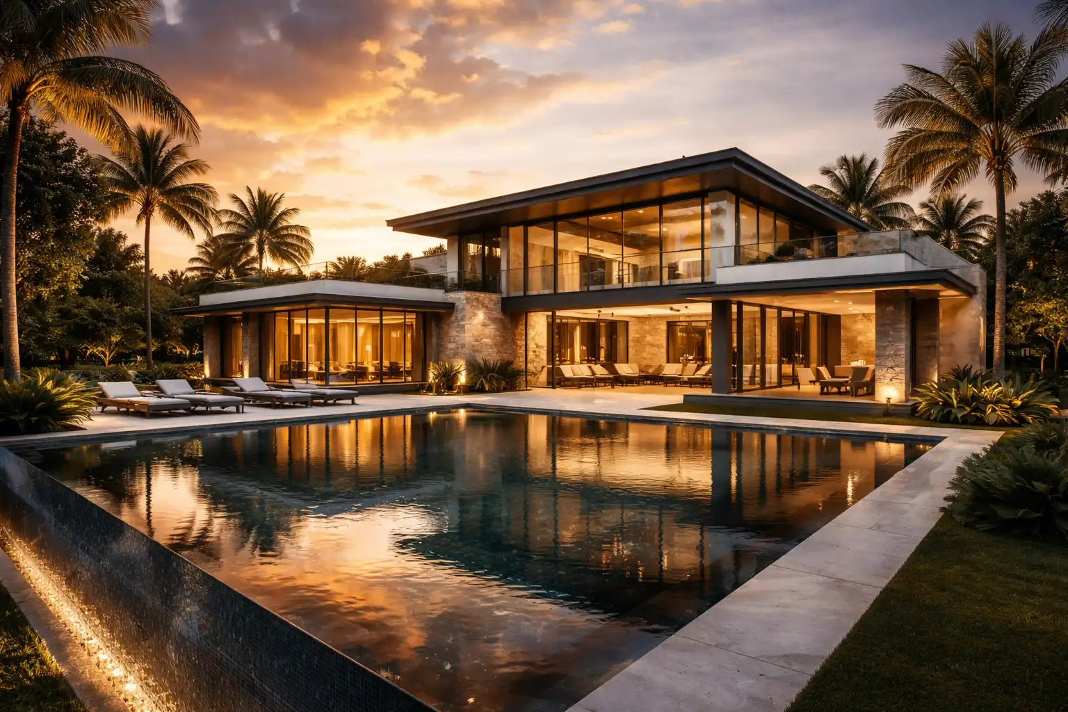 Prompt: A cinematic exterior shot of a modern luxury villa with clean architectural lines, large glass panels, and an open-plan design. The villa is surrounded by lush tropical landscaping with palm trees and perfectly manicured lawns. An infinity pool reflects the warm golden hues of sunset, creating a mirror-like effect. Soft outdoor lighting highlights the structure and textures of stone and wood materials. Shot during golden hour with dramatic sky, ultra-realistic lighting, 8K resolution, wide-angle lens, real estate photography style, high contrast, detailed reflections, photorealistic finish.