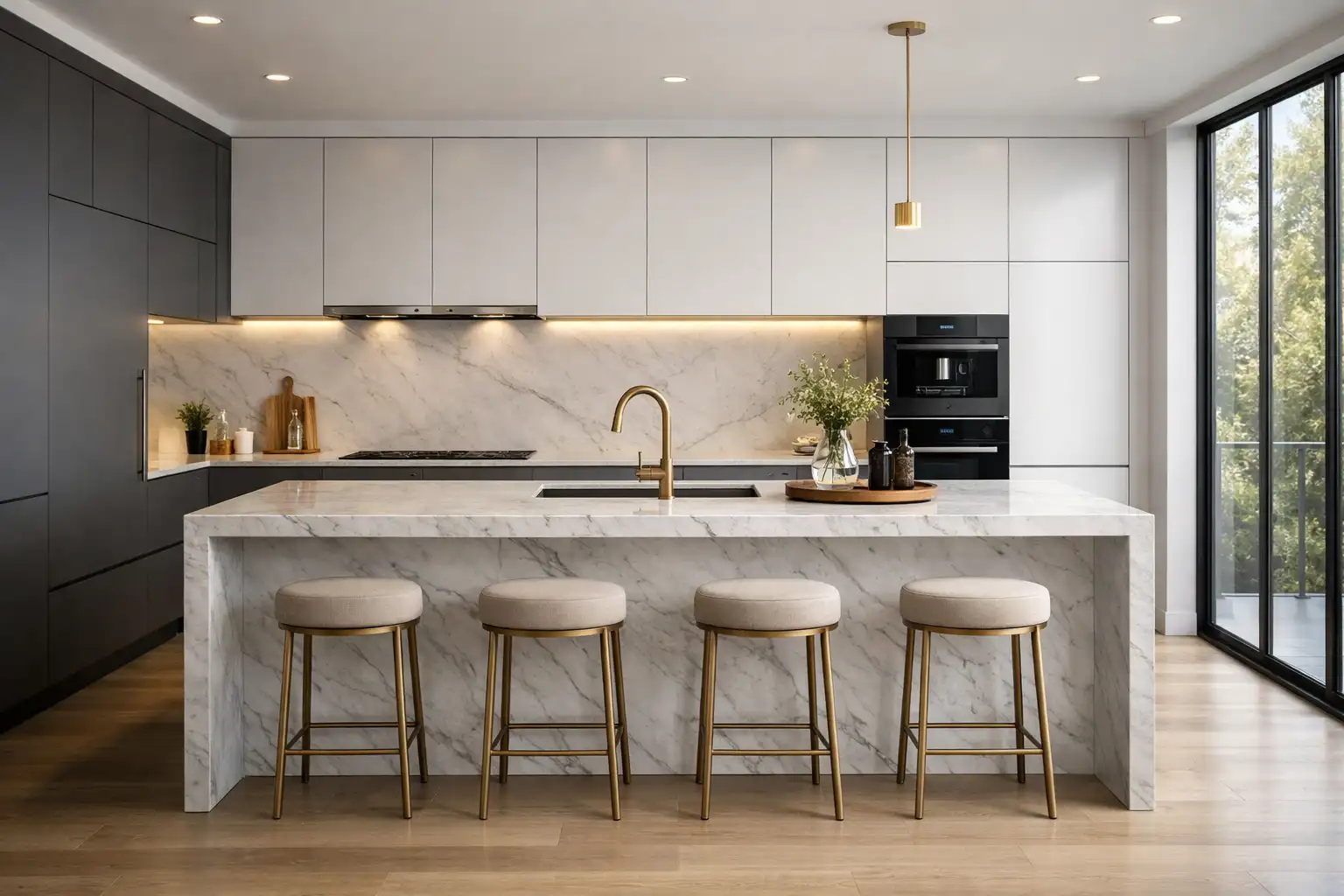 Prompt: A high-end luxury kitchen interior designed in a minimalist modern style. A large marble island with waterfall edges serves as the centerpiece, paired with sleek handleless cabinetry in matte finishes. Integrated premium appliances blend seamlessly into the design. Gold or brushed brass fixtures add subtle elegance. Under-cabinet lighting and soft ambient illumination enhance depth and realism. Clean lines, clutter-free composition, natural light entering through large windows, ultra-detailed textures, photorealistic rendering, 8K resolution, architectural photography style.
