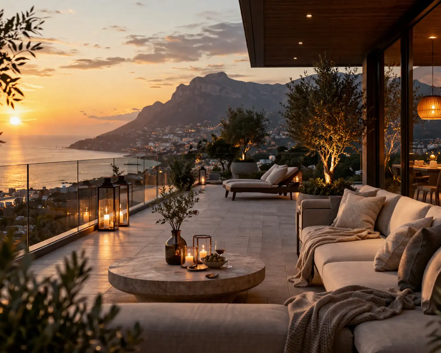 Prompt: A cinematic wide-angle shot of a luxurious outdoor balcony attached to a high-end modern residence, featuring elegant contemporary outdoor furniture with plush neutral-toned cushions and a sleek glass railing offering uninterrupted panoramic views of a breathtaking landscape (ocean horizon, mountain range, or illuminated city skyline). The scene is captured during golden hour sunset, with warm soft light casting long natural shadows and creating realistic reflections on glass and polished surfaces.