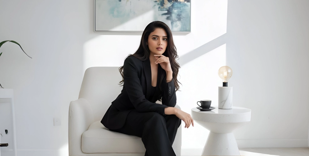 "A poised and self-assured woman dressed in a sleek black suit sits gracefully on an elegant white chair that complements her refined silhouette. Her posture is composed and confident, with her right hand softly supporting her chin and her face slightly lifted. She tilts her head gently to the right, maintaining a calm, direct gaze that reflects inner strength. Cinematic, high-end lighting delicately illuminates her features, bringing out her natural elegance and depth. The setting is a clean, pure white space accented by a rare artistic painting and subtle ambient lighting. A modern white side table stands beside the chair, adorned with a black coffee cup and a minimalist designer lamp, adding a touch of luxury and sophistication to the overall scene."