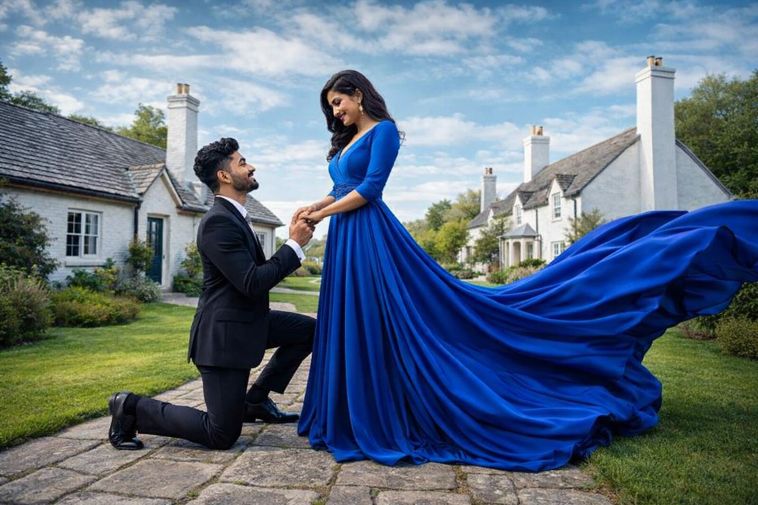 Ultra-realistic pre-wedding photoshoot using the uploaded reference image. Same couple, exact same faces (100% identity match), same skin tone, same facial structure, same hairstyle, same expressions — no changes at all. white cottage-style houses with grey tiled roofs, tall white chimneys, stone pathways with green grass lines, lush greenery, blue sky with soft clouds. – Man wearing the same black suit, same shoes, same styling – Woman wearing the same royal blue flowing gown, same fabric, same design Romantic proposal pose: man kneeling and holding the woman’s hand, woman standing gracefully. Shot in a wide-angle lens (16–18mm), full-body, full scene visible, more space around the couple, cinematic depth and scale, dramatic fabric flow of the blue gown. Professional pre-wedding photography, cool modern tone, cinematic color grading, natural daylight, realistic shadows, ultra-sharp focus, natural skin texture, editorial luxury wedding style, 8K, photorealistic, masterpiece.