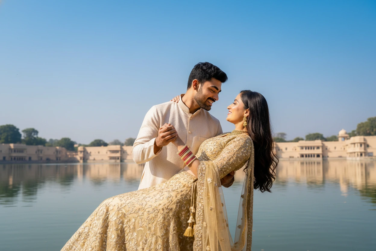 Create a high-resolution, ultra-HD romantic outdoor scene set beside a peaceful lake under a clear, vivid blue sky. A couple dressed in elegant traditional Indian clothing is the focus of the image. The woman is wearing an intricately designed golden lehenga with rich detailing, while the man is dressed in a soft, light-colored kurta. The man gently holds the woman in a graceful dip, and she clasps his hands as she looks at him with deep affection. Their expressions should convey warmth, love, and emotional connection. In the background, the lake appears calm and reflective, adding serenity to the scene. Across the water, refined buildings with classic traditional architectural designs enhance the cultural elegance of the setting. The lighting should be natural, bright, and sun-lit, creating a warm, romantic atmosphere with a luxurious and cinematic feel. Important: The faces must match the uploaded reference image exactly, with no alterations whatsoever, maintaining 100% facial accuracy.