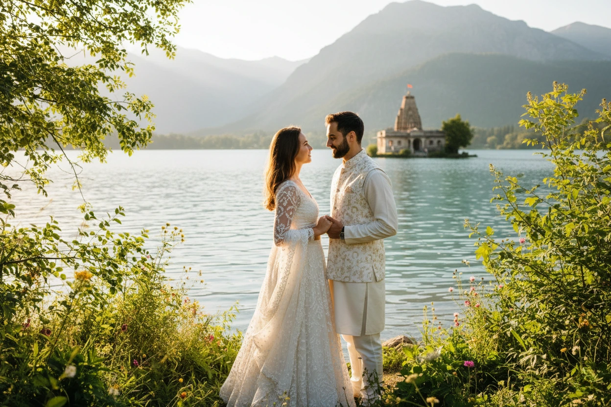 A romantic couple wearing flowing, elegant white traditional garments stands closely together at the edge of a crystal-clear lake. Their hands are gently intertwined, and they gaze into each other’s eyes with soft, loving expressions. The scene is framed by lush green trees, vibrant foliage, and delicate wild plants in the foreground. Towering mountains rise gracefully in the background, their peaks lightly softened by atmospheric haze. A historic stone building with classic architecture is visible across the lake, blending naturally into the landscape. Warm golden sunlight filters through the scene, creating a dreamy glow, subtle reflections on the water, and soft highlights on the couple’s attire. The overall mood is peaceful, romantic, and cinematic, with natural beauty enhancing the emotional intimacy of the moment.
