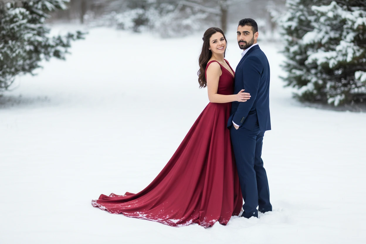 Create an elegant romantic couple portrait set outdoors in a winter landscape. The scene takes place on snow-covered ground, blending the crisp beauty of winter with a refined, intimate mood. The woman is dressed in a striking, full-length red gown that flows gracefully, with her hair styled in soft, natural waves. She stands slightly angled, wearing a warm and gentle smile that adds charm and tenderness to the moment. The man wears a tailored navy blue suit paired with a clean white shirt. He stands confidently, glancing back over his shoulder in a relaxed yet poised manner. Behind them, touches of rich greenery contrast beautifully with the snow, adding depth and visual balance to the scene. The overall atmosphere should feel calm, romantic, and sophisticated, capturing timeless elegance within a serene winter setting.