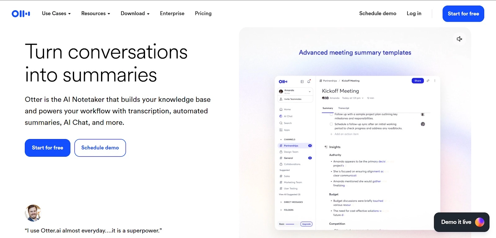 Otter is a tool for transcription and note-taking, enabled by Artificial Intelligence technology, which enables the automatic transcription and creation of text from audio conversations, providing precise and real-time text representations of conversations being held in an audio format, like in the case of meetings, interviews, lectures, podcasts, etc., including the automatic determination of who is speaking in a conversation, highlighting important points, creating summaries, and other advanced capabilities like the ability for users to edit the generated transcript, make comments, share the generated text file with other team members, and export the file in different formats, apart from also being integrated with other popular Video Conferencing Platforms to allow for the recording and automatic transcription of meetings, through the automatic creation of text from the audio conversation, helping the user to remain focused and collaborate without worrying about the loss of critical information.