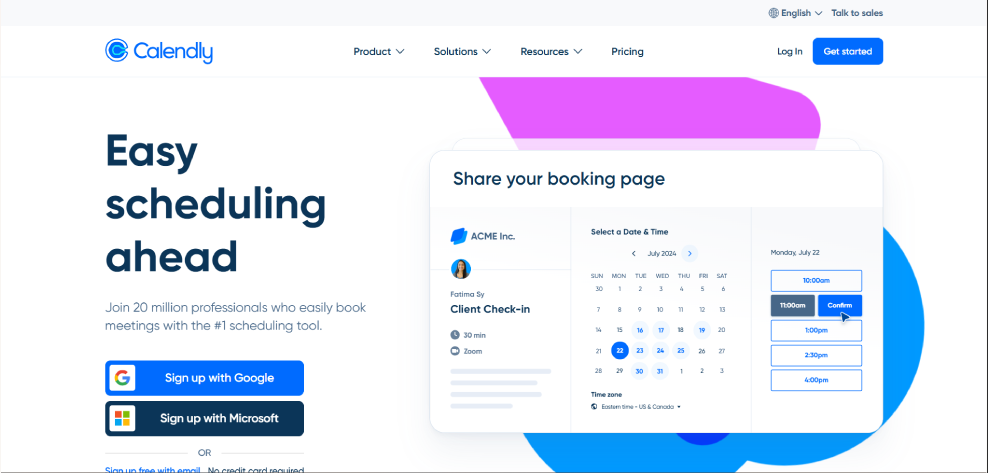 | Calendly | Scheduling & time management | Easy meeting scheduling | Calendar sync, booking links, reminders | Free plan available |