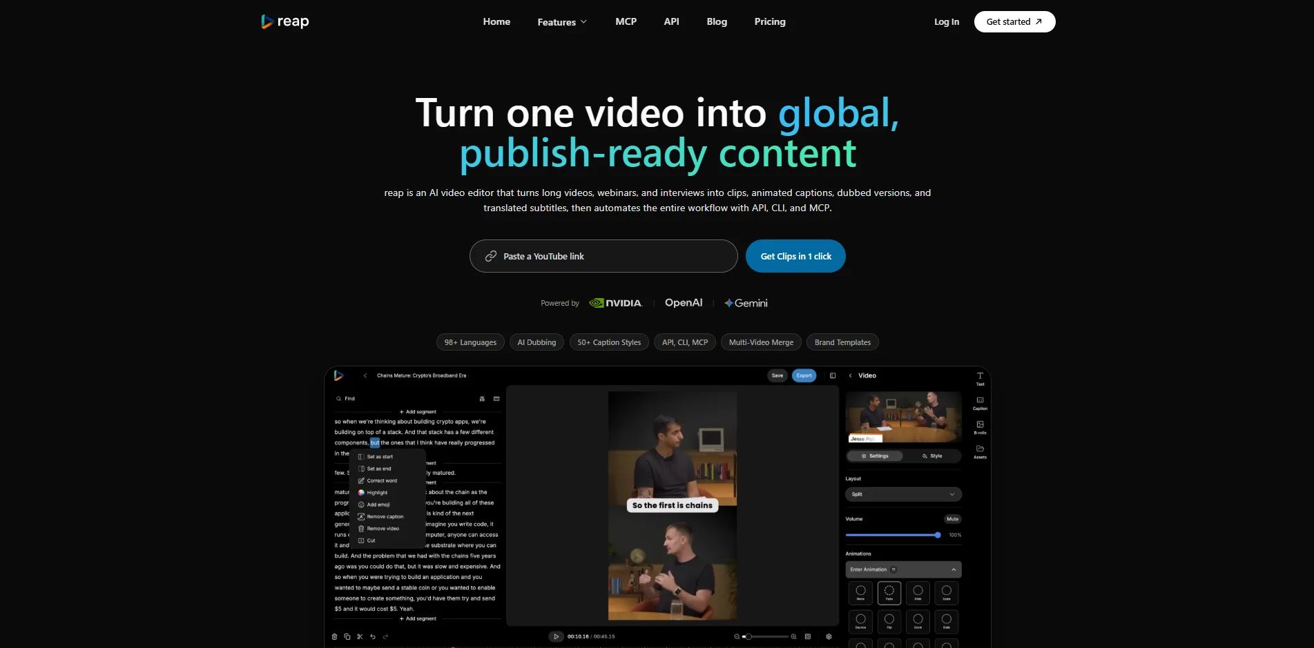 | Main Use | Auto clipping | Editing | Captions | Text-to-video | Full workflow |