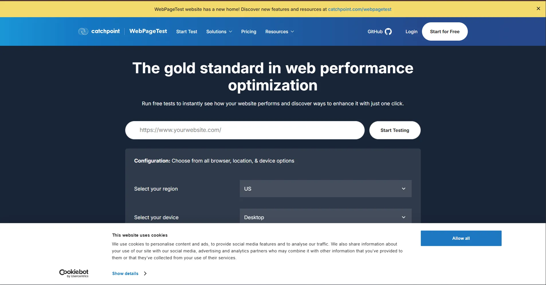 WebPageTest is an advanced website speed testing tool. It is widely used amongst developers and performance engineers. It provides an extensively customizable speed test environment, including geographical regions, devices, and network speeds. It provides a realistic insight into the performance metrics as perceived by users across the world. It allows users to monitor video captures and filmstrip analyses of page loads over time. It is used to detect performance bottlenecks encountered by users regarding the time allotted to rendering, receiving resources, and executing scripts. It is an apt tool to use on a large-scale website or application that requires a detailed performance review.